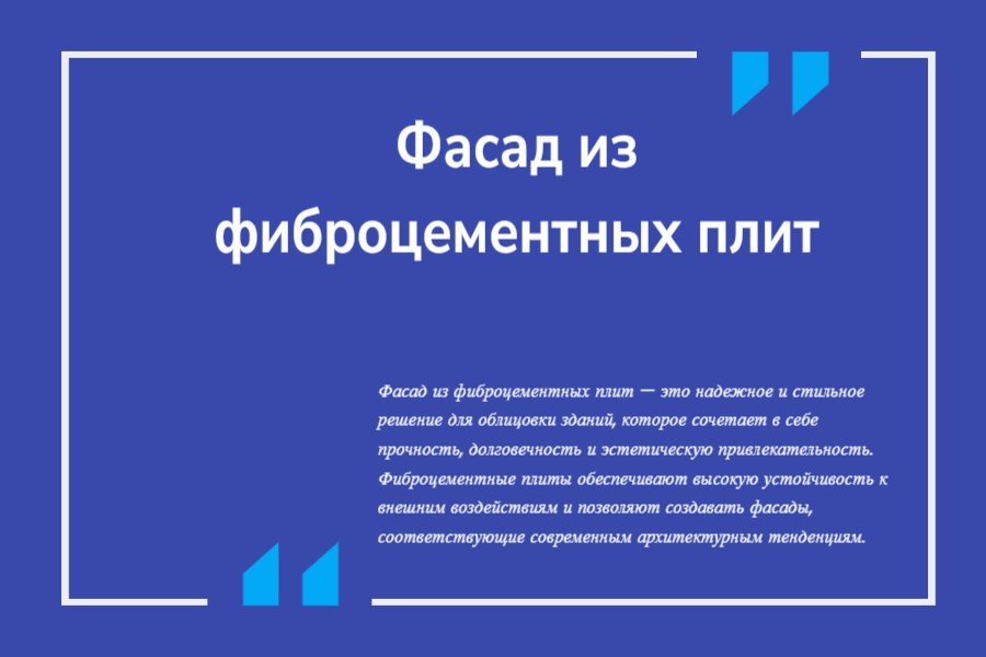 Фасад из фиброцементных плит — это надежное и стильное решение для облицовки зданий, которое сочетает в себе прочность, долговечность и эстетическую привлекательность. Фиброцементные плиты обеспечивают высокую устойчивость к внешним воздействиям и позволяют создавать фасады, соответствующие современным архитектурным тенденциям.